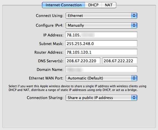 e.g. if you are using 192.168.1.64 to 192.168.1.253, the internal network interface of the AEBS will be assigned the IP address 192.168.1.1. This is also the default route and domain name server for clients on your internal network.