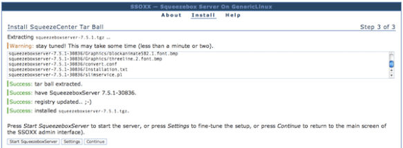 • Follow the instructions in SSOXX to upload the squeezeboxserver-7.5.1.tgz file you downloaded earlier and then install the SqueezeCenter tar ball