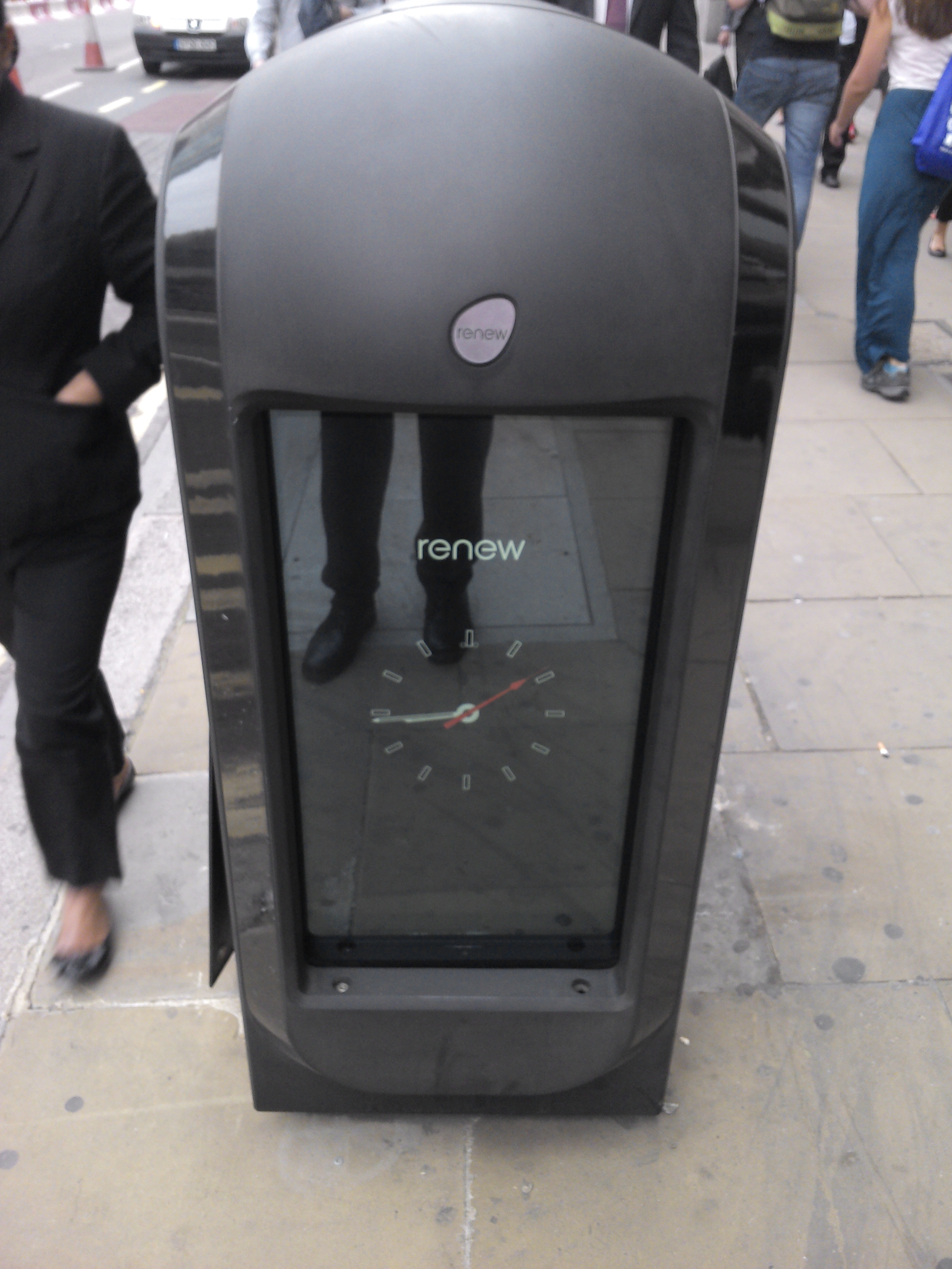 Today’s example is the case of the Renew London waste recycling bins, which have been appearing on City of London streets since January 2012. As well as being a regular waste bin they are equipped with a large screen on each side for displaying digital advertising.