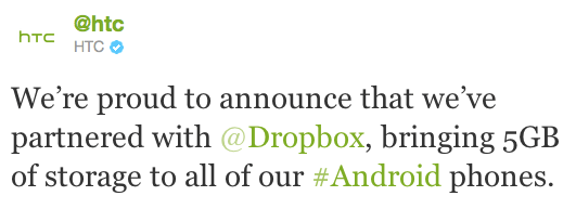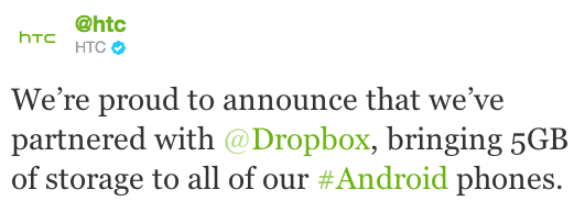 The bonus space is time-limited and only available to owners of a HTC phone with the new Sense 3.5 ROM. This is very different to HTC’s announcement: “We’re proud to announce that we’ve partnered with @Dropbox, bringing 5GB of storage to all of our #Android phones.