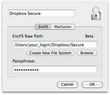 The first time you run DropSec it will prompt you for your EncFS password which it stores in your local login keychain. The password must match the secure password you set in a previous step.